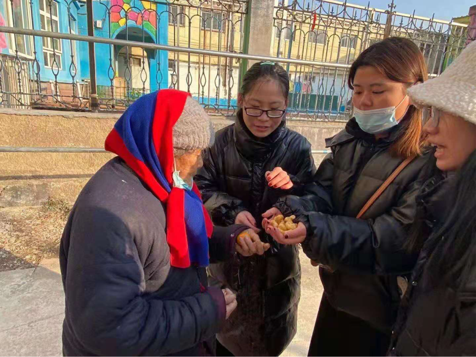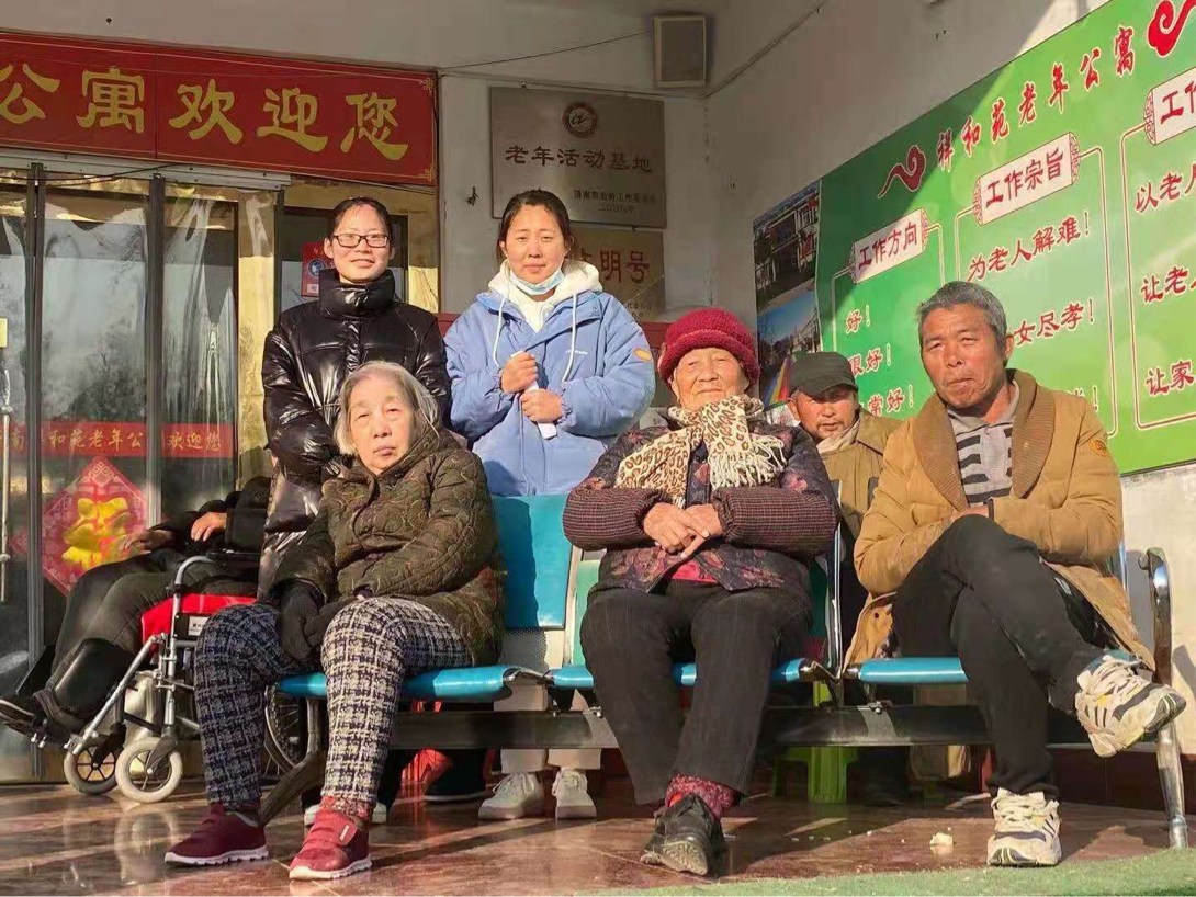 中午会有专门的午餐自助可以自己选择喜欢的午饭,下午可以散散步晒晒太阳,晚上还经常组织晚会,看电影等等。一天的生活很丰富。在采访中一个老人的袖口破了因为是冬天,里面的棉花都露出来了队员们看到这一幕于心不忍跑到外面买来了针线,其实在她们之中没有人会做针线活。但看到老人这样心里真的不舒服,于是临时从手机上找来视频一点一点地学,期间有一位同学的手还因为不会用针线扎破了但怕老人担心她用卫生纸按住没有说。功夫不负有心人虽然缝的很丑但是还是把老人的袖口补好了,老人很感动掉下来了眼泪,可能这只是一件小事但是触碰了他内心柔软的部分。儿女工作忙已经很久没有回来看她和老伴了虽然很想但是儿女要工作还是不忍心催他们。有一个老奶奶说:“看到你们就想起来自己的孩子这么大的时候,那个时候我们还年轻,现在老了什么也干不了想孩子了也不好催他们回来,年轻人还需要上班都挺忙的。看到你们我也很高兴了就像看到自己的孩子”听到这里作为儿女们应该注意到把父母送进养老院并不是解决了温饱就是完美了,同样应该被关怀的还有老人的精神。下午成员们两两分工,一组给老人洗头发,剪指甲盖,其他的一组洗衣服打扫卫生,把老人舍不得扔的东西断舍离,缺的东西再买来补上,年纪大了总是舍不得吃舍不得用。看到收拾好的房间老人们笑的十分开心。