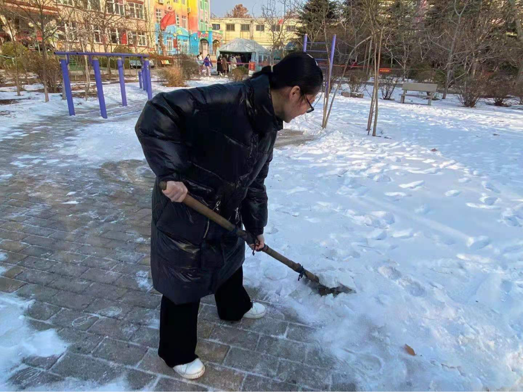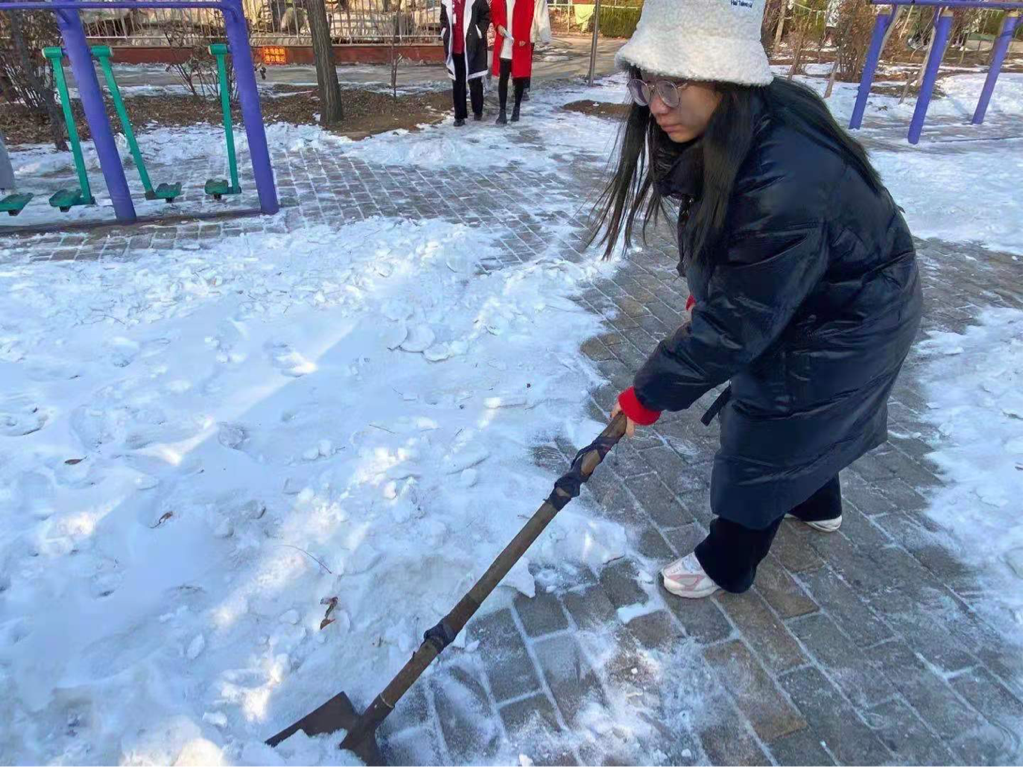 如图刚下完一场大雪,我们冒着冬日的严寒在院子里拿着扫帚铁锹扫雪除雪,避免腿脚不便的老人因路面湿滑而摔倒,也让院子更加的干净,使老人的心情也更为舒适。我们也为自己可以给老人制造一个惬意的环境而快乐着。